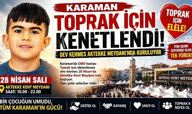Karaman, DMD hastası Toprak bebek için şimdiye kadar düzenlenen en kapsamlı dayanışma organizasyonlarından birine hazırlanıyor. Minik Toprak’ın tedavi sürecine destek olmak amacıyla organize edilen dev yardım kermesi, 28 Nisan Salı günü Aktekke Kent Meydanı’nda kapılarını açacak.