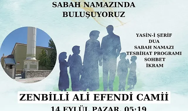 Konu ile ilgili Karaman İl Müftülüğü’nden yapılan açıklama şöyle; “Her Pazar sabah namazında farklı bir camimizde bir araya geliyor, gönüllerimizi Seher vaktinde zikir sofrasında buluşturuyoruz.Program İçeriği:*Yasin-i Şerif*DuaSabah Namazı*Tesbihat Programı*Sohbet*İkram14 Eylül Pazar, Saat: 05:19Bu Hafta: Zenbilli Ali Efendi CamiiTüm kardeşlerimizi aileleriyle birlikte bu güzel buluşmalara davet ediyoruz.”Zembilli Ali Efendi Kuran Kursu NeredeYHM Market YanıZembilli Ali Efendi, 797. Sk. No:1, 70200 Karaman Merkez/Karaman