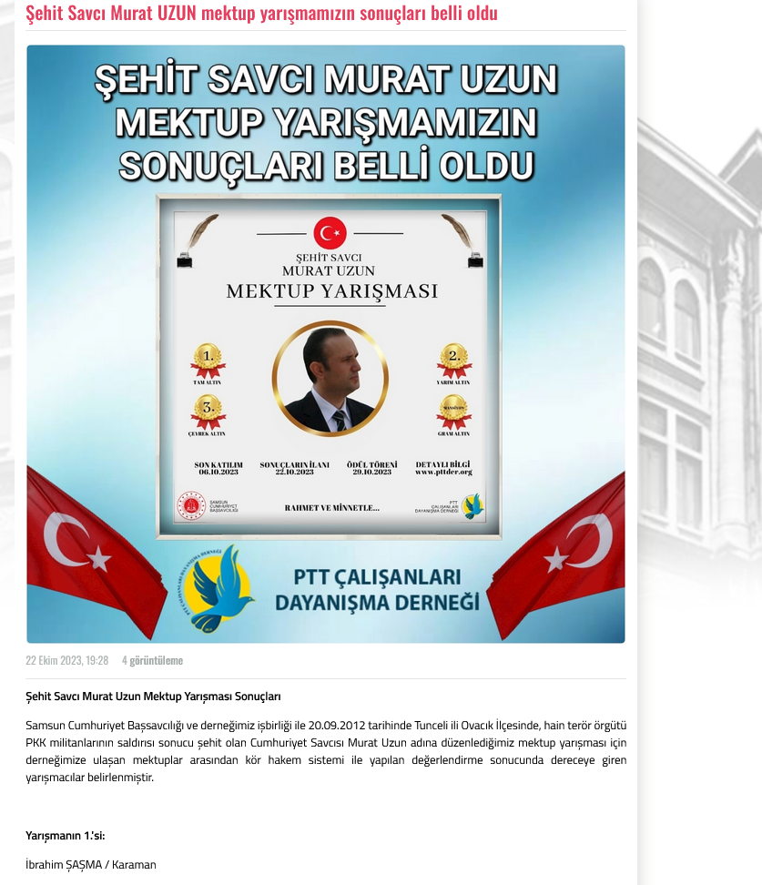 Samsun Cumhuriyet Başsavcılığı, PTT Çalışanları Dayanışma Derneği işbirliği ile Samsun Aile ve Sosyal Hizmetler İl Müdürlüğü ve Samsun İl Milli Eğitim Müdürlüğü’nün destekleri ile tertip edilen, 20.09.2012 tarihinde Tunceli ili Ovacık İlçesinde, hain terör örgütü PKK militanlarının saldırısı sonucu şehit olan Cumhuriyet Savcısı Murat Uzun adına mektup yazma yarışmasında İbrahim Şaşma birincilik ödülüne layık görüldü.
