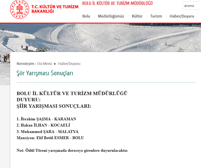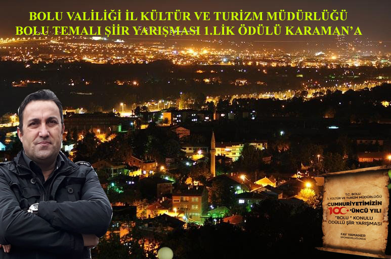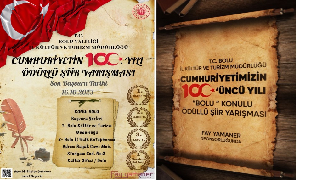Bolu İl Kültür ve Turizm Müdürlüğü ve Bolu Abant İzzet Baysal Üniversitesi Fen Edebiyat Fakültesi tarafından Cumhuriyetin 100. Yılı anısına tertip edilen Bolu temalı şiir yarışmasında Şair Şaşma’nın eseri birincilikle taçlandırıldı.