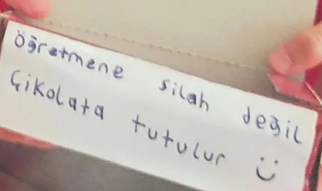 Karaman Temizel-Ünlü Mesleki ve Teknik Anadolu Lisesi öğrencileri, yaşanan olumsuzluklara dikkat çekmek ve öğretmenlerine olan sevgilerini göstermek amacıyla örnek bir davranış sergiledi. Öğrenciler, öğretmenlerine çikolata hediye ederek “Öğretmene silah değil, çikolata tutulur” mesajı verdi.Okulda duygusal anların yaşandığı etkinlikte öğretmenler, öğrencilerin bu duyarlı yaklaşımını takdirle karşıladı. Eğitim ortamlarında sevgi ve saygının önemine dikkat çeken bu anlamlı hareket, şiddetin değil dayanışmanın ve hoşgörünün ön plana çıkması gerektiğini bir kez daha gözler önüne serdi.