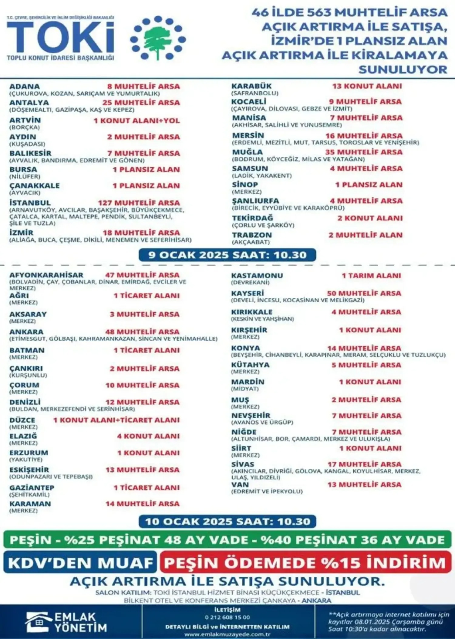Toplu Konut İdaresi Başkanlığı (TOKİ), 9-10 Ocak 2025 tarihlerinde Türkiye genelinde 46 ilde 563 arsayı açık artırma yöntemiyle satışa sunuyor.